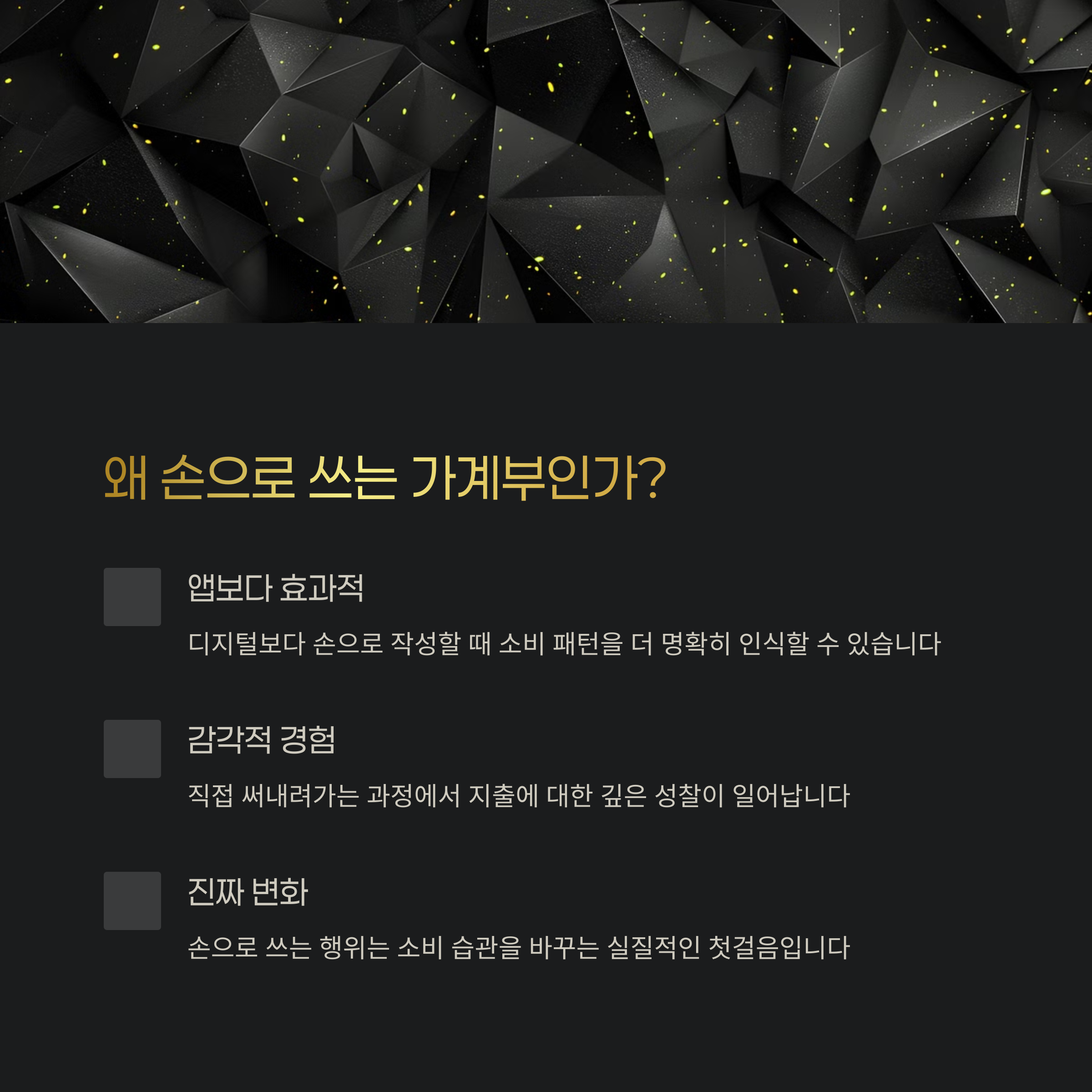 요즘은 자동으로 기록되는 가계부 앱도 많지만, ‘손으로 적는’ 가계부는 여전히 강력한 힘을 가집니다. - 적는 동안, 자신의 소비를 ‘다시 한 번’ 마주하게 됩니다 - 기억보다 느리게 기록되니, 소비에 대한 인식이 깊어집니다 - 하루 한 줄 쓰는 것만으로도, 재정 흐름이 눈에 들어옵니다