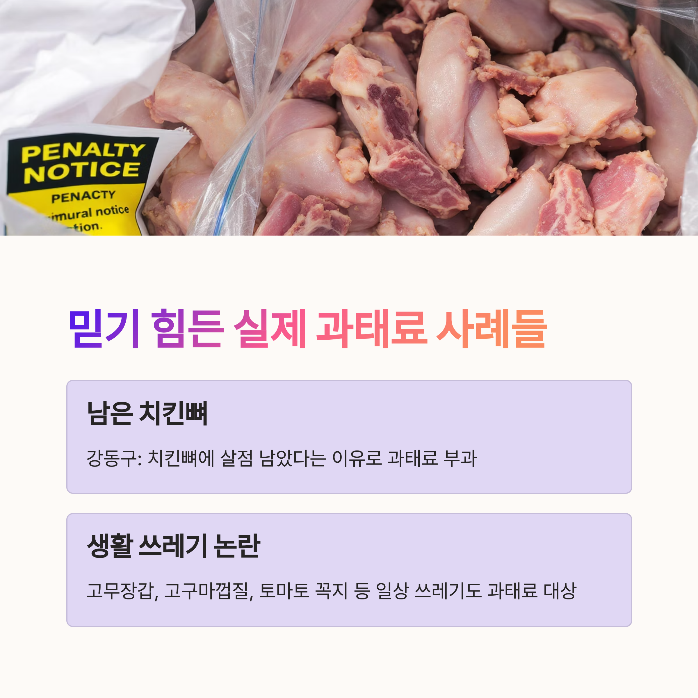 요즘 SNS나 커뮤니티에서 자주 보이는 이야기, “치킨 뼈 버렸다가 10만 원 벌금 맞았다더라.” 처음 들으면 믿기 힘들지만, 실제로 과태료가 부과된 사례들이 이어지고 있습니다. 고무장갑, 토마토 꼭지, 심지어 고구마 껍질까지 ‘분리배출 오류’라는 이유로 과태료가 나가고 있죠. 우리가 쓰는 종량제 봉투, 이제는 쓰레기 하나하나도 ‘시험 보듯’ 고민하게 되는 상황입니다.