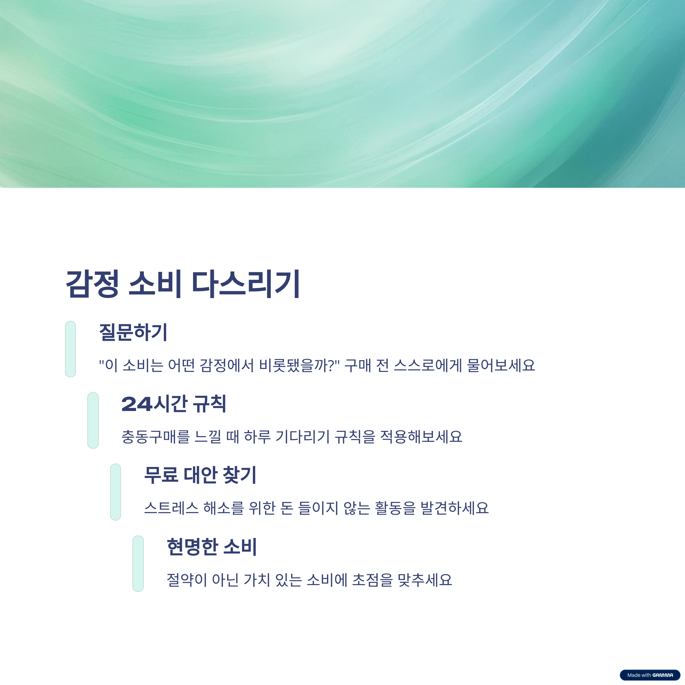이 소비가 나를 위한 것인지, 단순히 감정을 달래기 위한 것인지를 자문해보는 습관이 중요합니다. 관련 글: 부자가 되고 싶은 당신, 이미 ‘불안의 덫’에 걸렸을지도 모릅니다