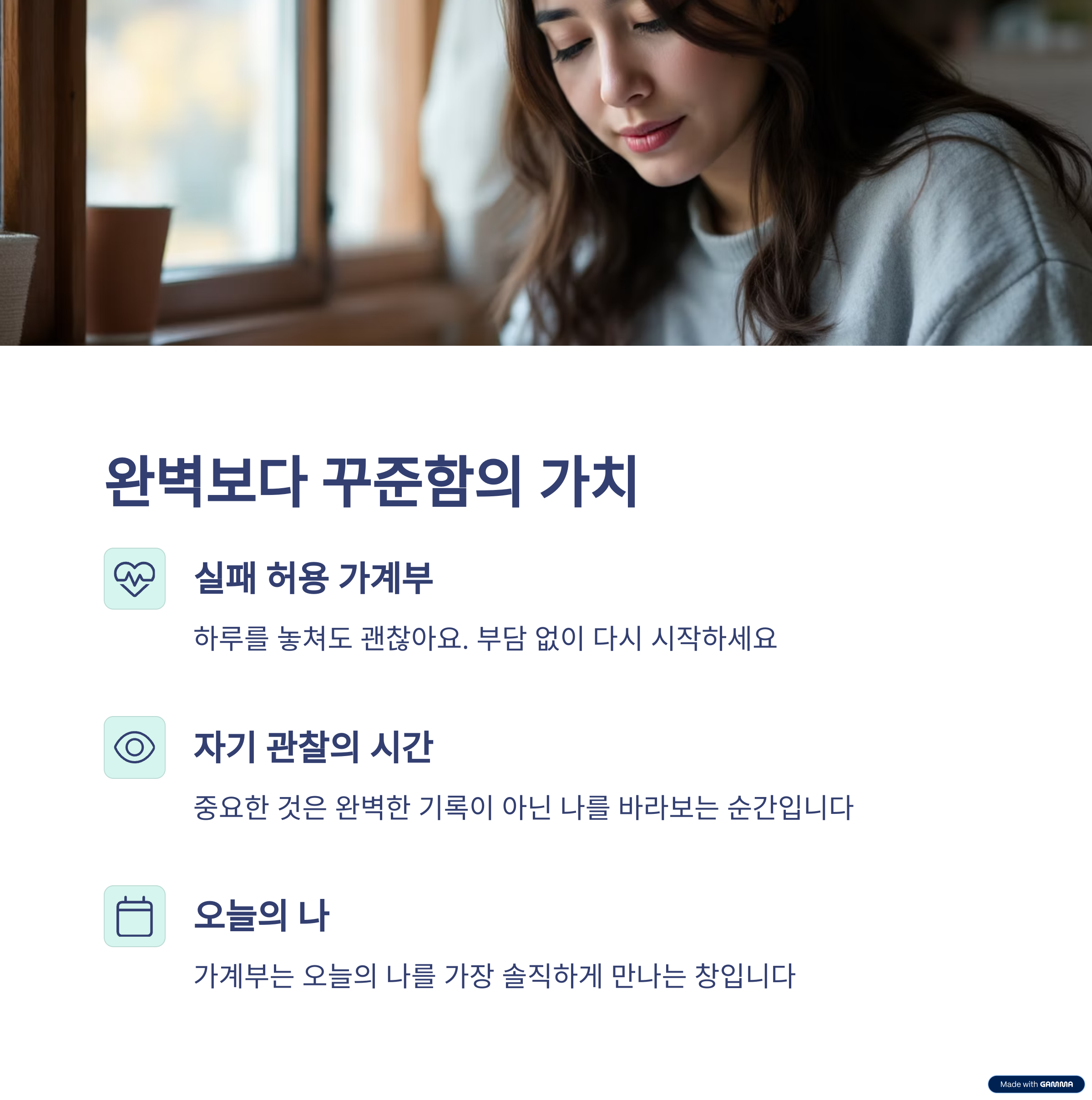 오늘 무엇을 얼마나 썼는지가 아니라, **왜 그걸 쓰고 싶었는지**를 먼저 적어보세요. 소비의 진짜 이유를 마주하는 힘이 됩니다.