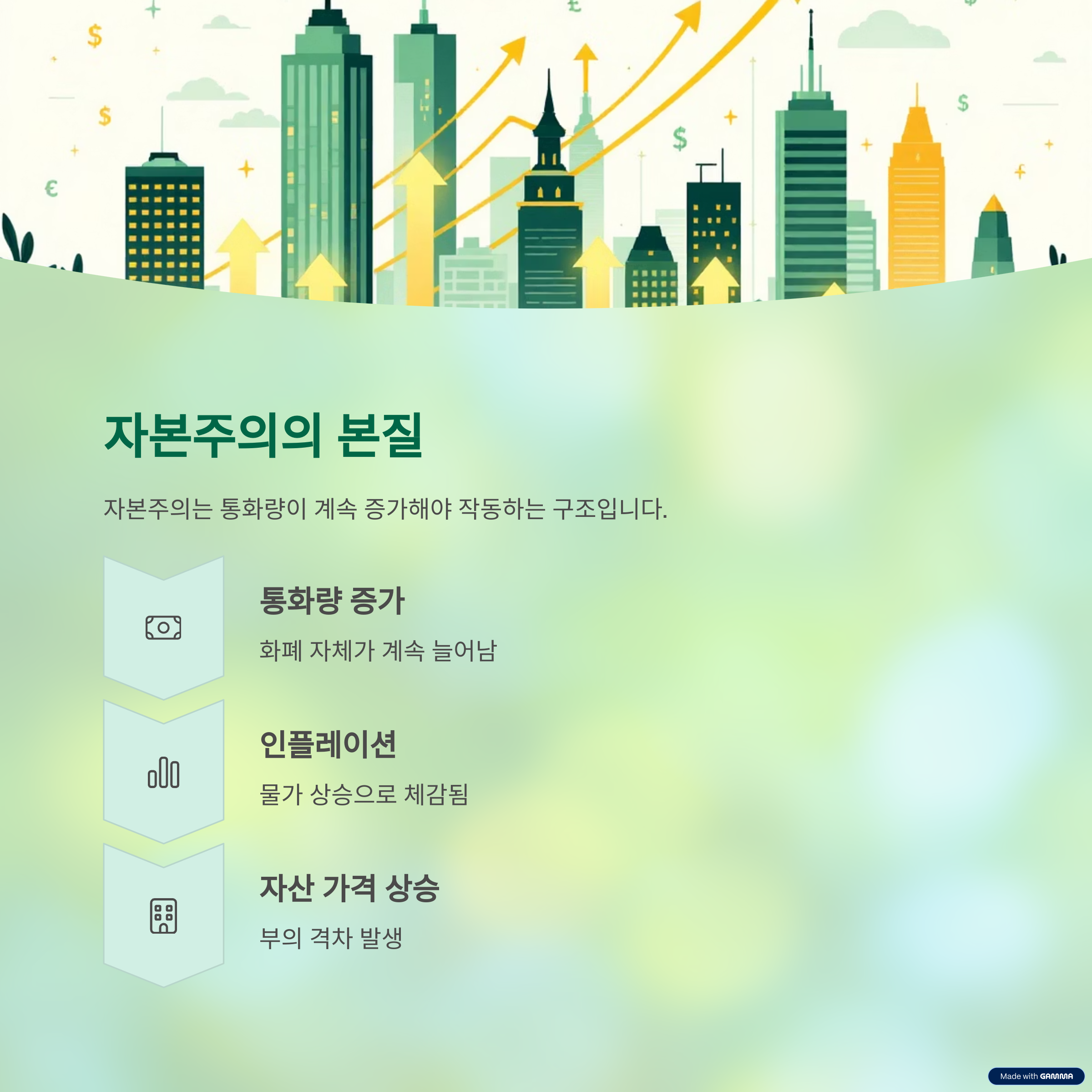 자본주의는 ‘통화량이 계속 증가해야 작동하는 구조’를 가집니다. 우리가 어릴 적 먹던 2,000원짜리 짜장면이 7,000원이 된 이유는 단순히 식자재 가격 때문이 아닙니다. 화폐 자체가 계속 늘어나기 때문이죠. 이 통화량 증가는 인플레이션이라는 이름으로 자산 가격을 끌어올리며, 부의 격차를 만들어냅니다.