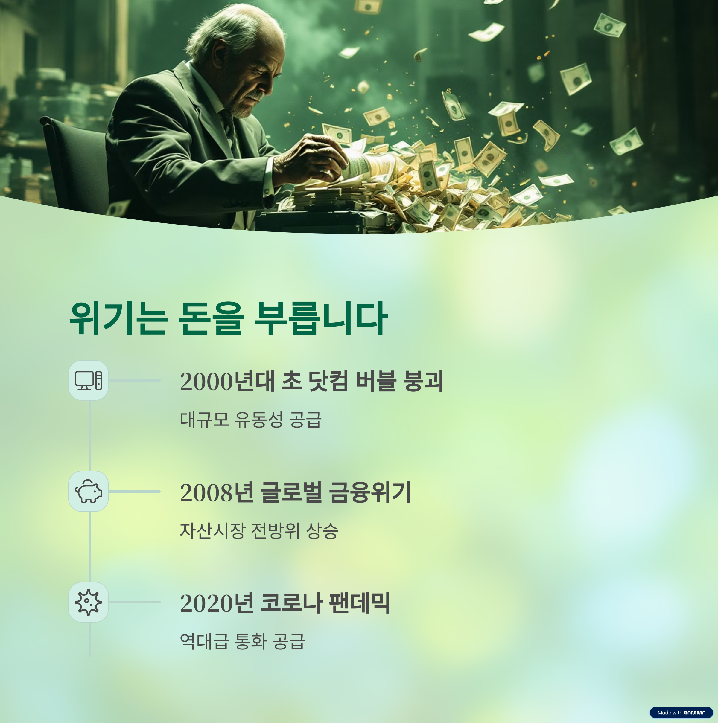 • 경제 위기 때마다 유동성이 대량 공급되어 자산 가격을 밀어올립니다.