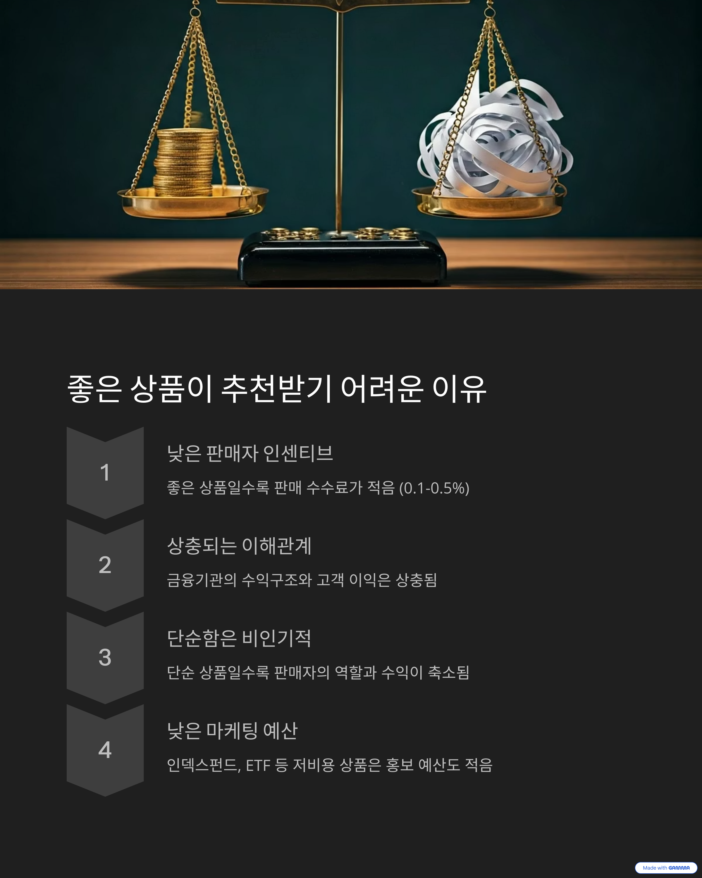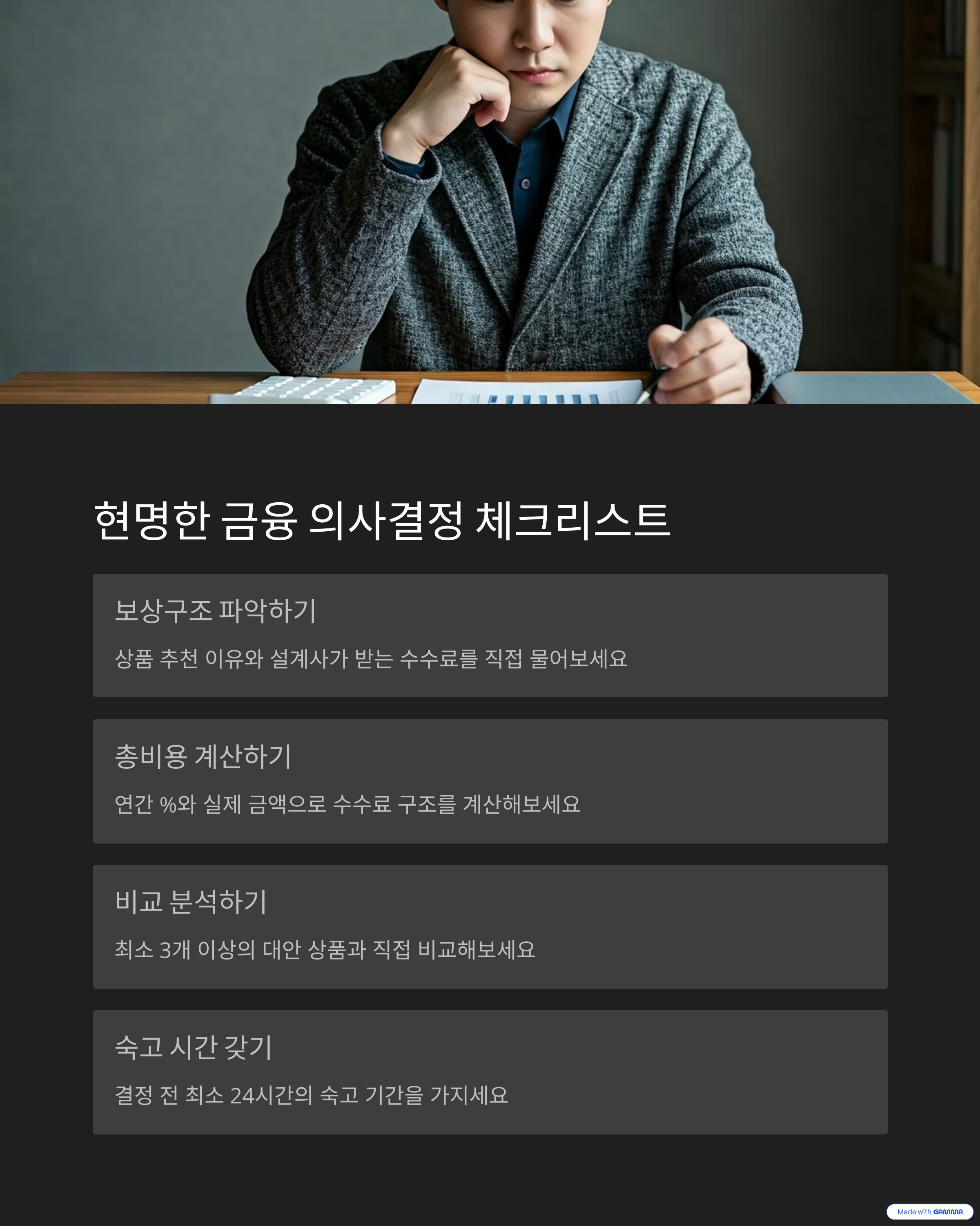 금융상품은 고객의 이익보다 **회사의 수익 구조**를 중심으로 설계됩니다. 주요 설계 기준은 다음과 같습니다: - 수수료가 높은 상품 - 해지율이 낮은 장기 상품 - 자산이 오래 묶이는 구조 - 고객이 쉽게 이해하기 어려운 복잡한 설명 구조 이러한 기준에 따라 만들어진 상품이 상담 시 ‘맞춤형’이라는 포장으로 제공됩니다.