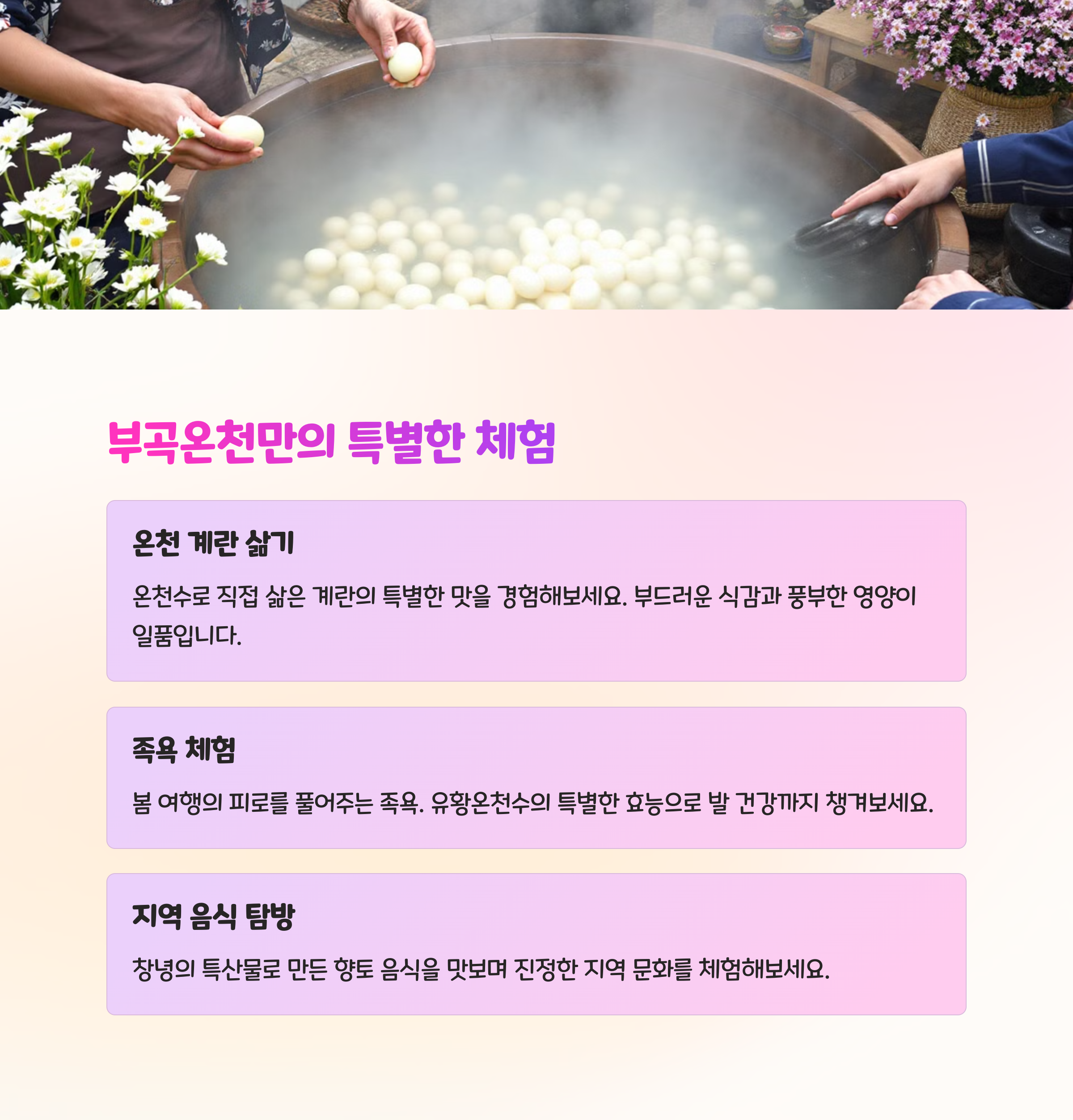 유황향 그윽한 족욕과 벚꽃 풍경을 함께 즐길 수 있는 봄맞이 힐링 여행지로 추천드립니다.